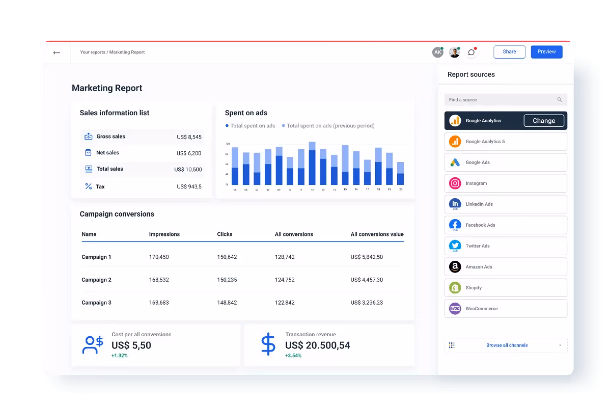 Whatagraph is a web-based reporting tool that lets marketing teams and agencies create beautiful reports in minutes instead of hours. You can automatically pull data from over 40 sources to compile engaging visual representations of marketing data and analytics.