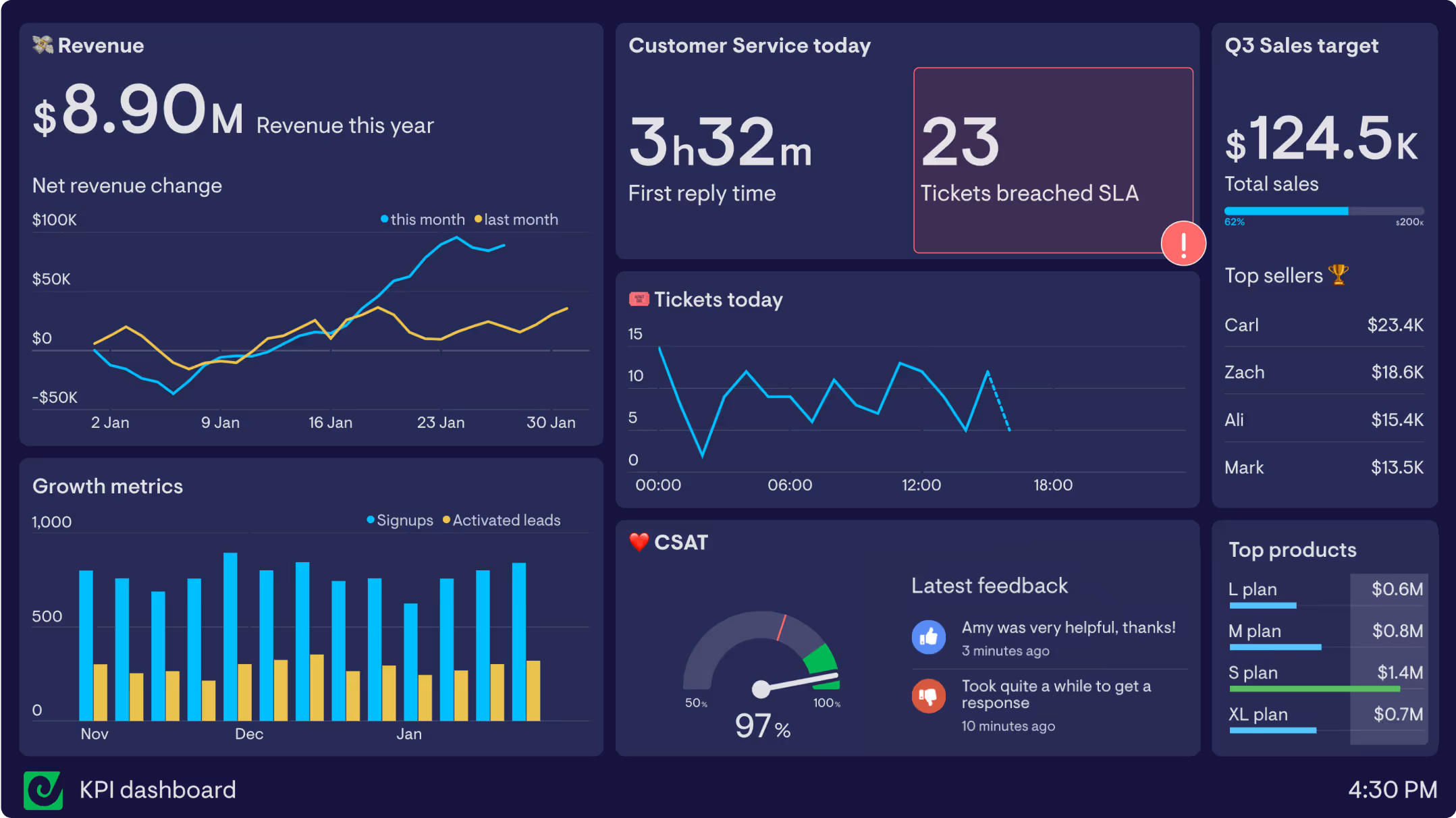 - KPI dashboards: Use the Geckoboard dashboard creator to turn your data into a professional-looking customizable dashboard.