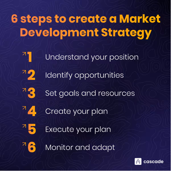 In this article, we’ll show you how to navigate these challenges. We’ll walk you through six easy steps to build your market development strategy. Our goal is to help you develop a resilient and adaptable strategy to conquer new markets and drive business growth. Plus, you get a free template to help you create an execution-ready plan.