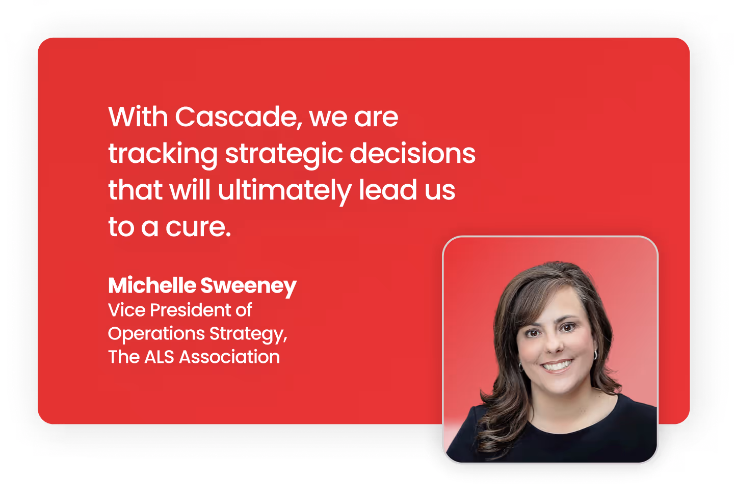 “Cascade checked all the boxes for our strategy execution. It provided us with the structure we needed to organize our work effectively and report both internally and externally with clarity. Along with the platform, Cascade's teams supported us along every step of the way.” – Michelle Sweeney, VP of Operations Strategy, The ALS Association