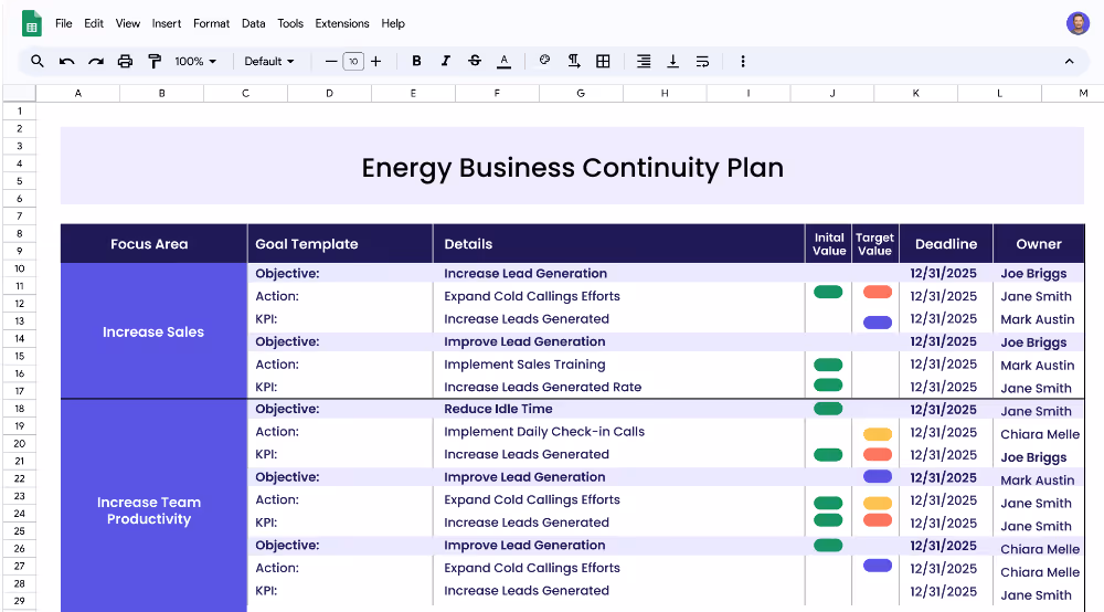 A focus area refers to the areas that the energy business continuity plan should address. Examples of focus areas could include strengthening energy infrastructure, improving cyber security, increasing backup power capacity, and streamlining business processes. Each focus area should have a set of objectives, actions, and measurable targets (KPIs) to help organizations achieve their desired outcomes.