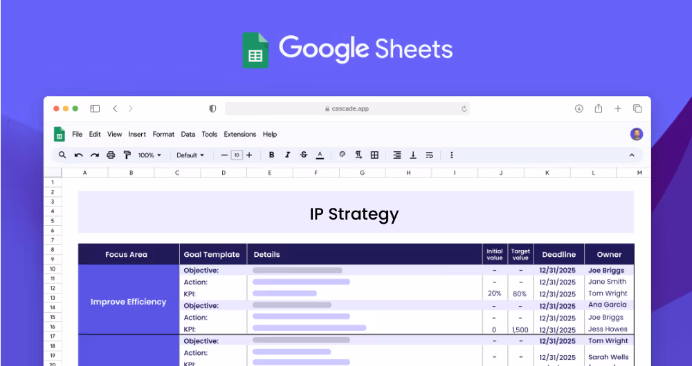 If you want to see quick and efficient results from your IP strategy, Cascade Strategy Execution Software is your go-to tool. Cascade transcends traditional spreadsheets by providing an integrated platform for centralized strategy execution. This not only enhances visibility through dynamic dashboards but also enables seamless collaboration across your team. Sign-up for free or book a demo with one of our strategy experts to learn how Cascade can accelerate your strategy execution.