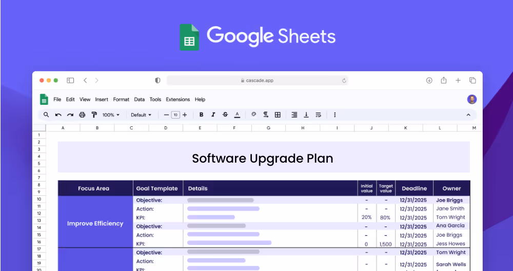 To expedite your strategy and achieve quicker, more measurable results, consider transitioning from spreadsheets to Cascade Strategy Execution Software. Cascade offers a robust platform that enhances real-time updates, centralized collaboration, and automated reporting. This allows for seamless strategy management and execution, removing the traditional barriers posed by spreadsheets. Sign-up for free or book a demo with one of our strategy experts to discover how Cascade can streamline your process.