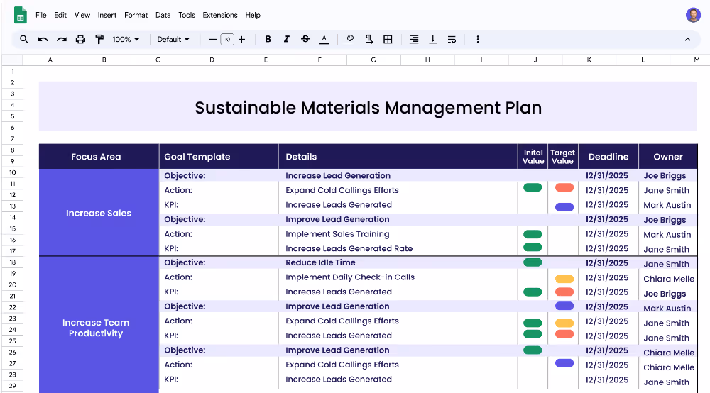 Objectives are the goals you want to achieve within each focus area. For example, under the focus area of reducing waste, you might set objectives such as increasing material efficiency and improving material management.