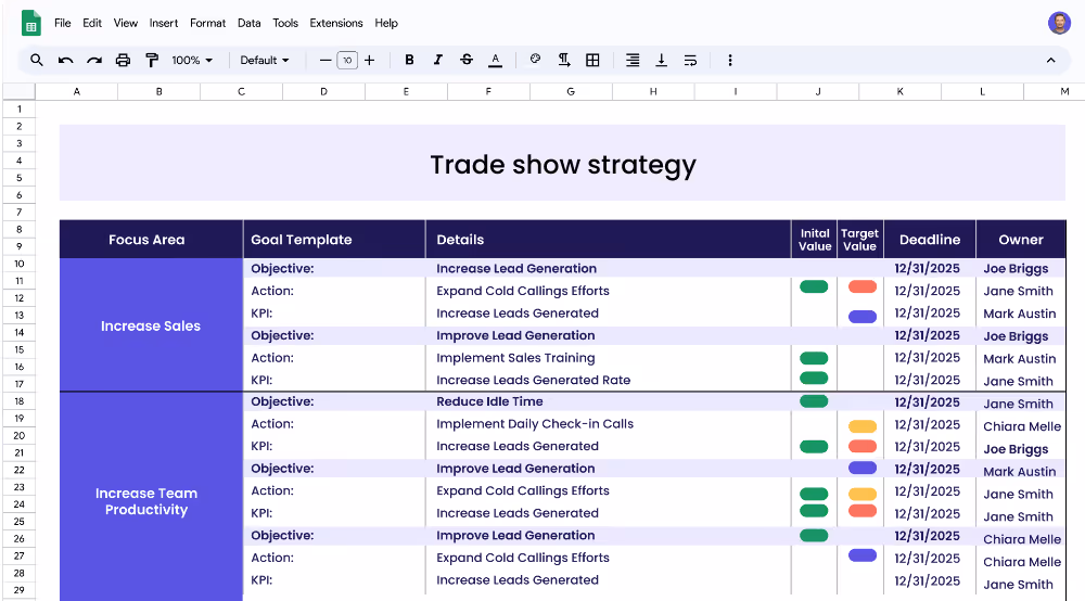 Your focus areas are the overarching goals you want to achieve from attending a trade show. These could include generating leads, maximizing ROI, monitoring performance, or any other goals that are important to your team. Defining clear focus areas helps you create measurable objectives and track progress.