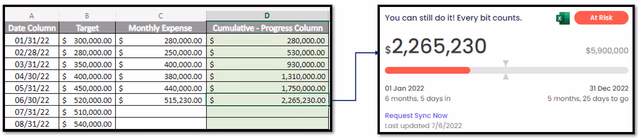 - An .xlsx spreadsheet in the account, with goal-progress values and easily-identifiable column titles. Something like this:DateMeasure NameTotal RevenueTotal ExpenditureMeasure Progress05/28/20225 million in profit2,000,0001,000,00020%