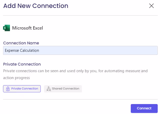 Note: A private connection can be used by only the person who created it, while a shared connection can be seen and used by everyone in your account for automating measure and action progress.