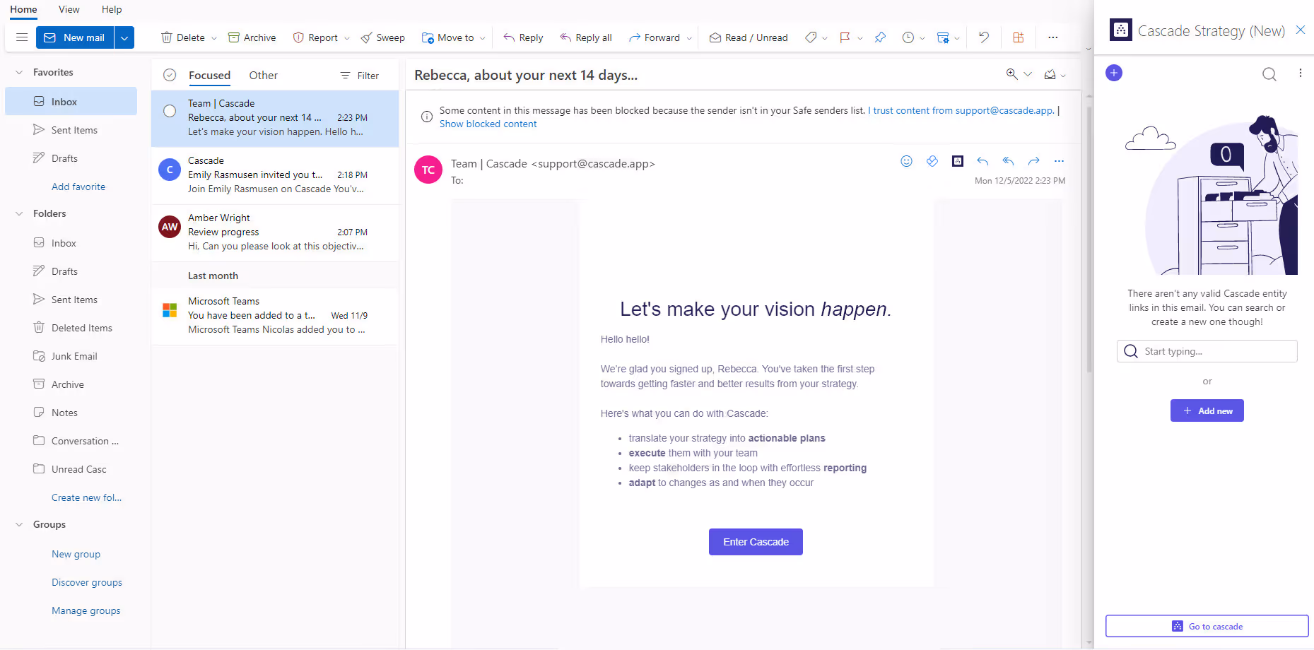Using the Cascade add-in, you can create, explore, and update objectives directly within Outlook. When you receive a mail in your Outlook with a Cascade link, you can click on the Cascade add-in from that mail, and manage it.