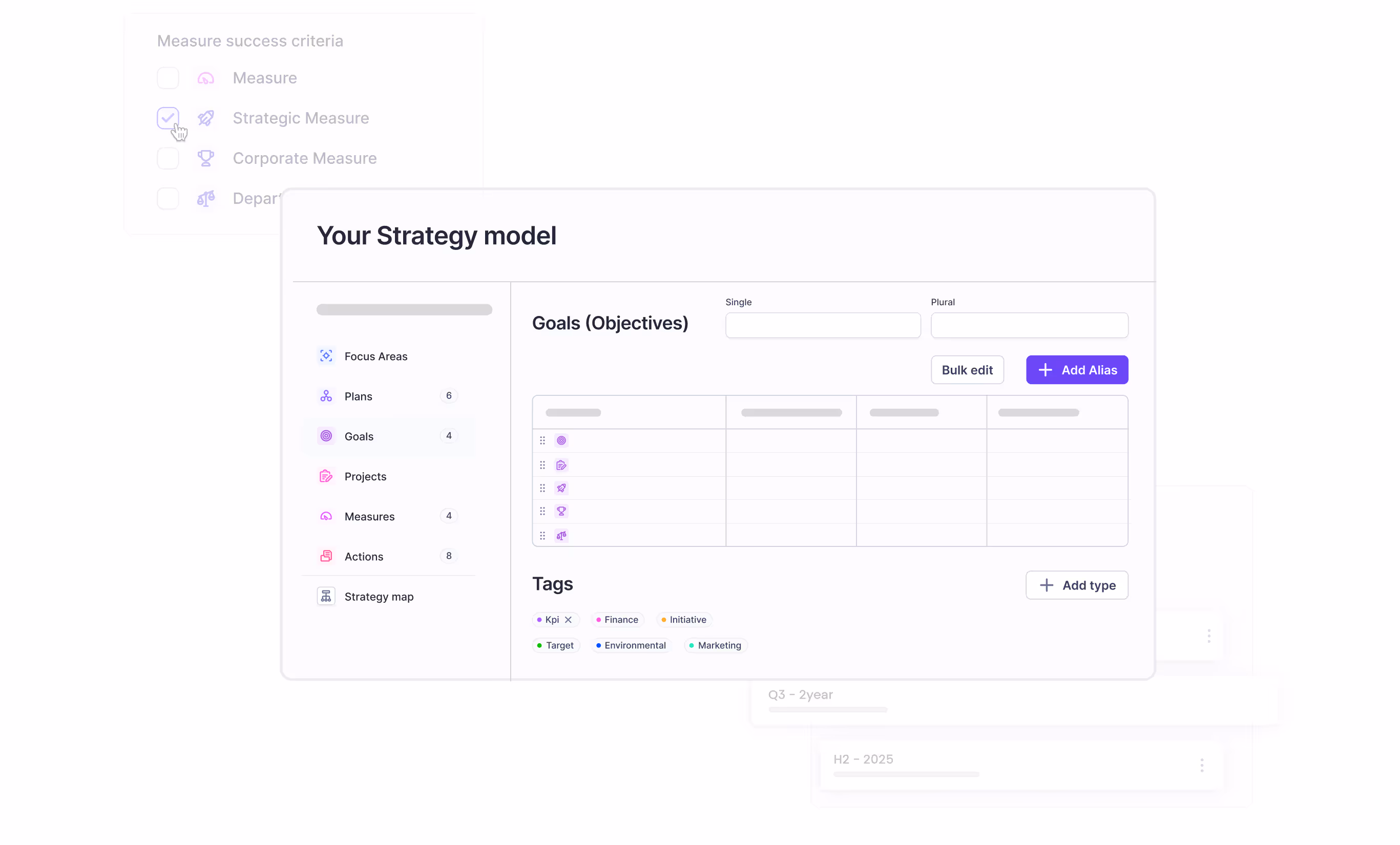 Define your ideal strategy model from terminology to business logic - including OKRs, PPM, Hoshin Kanri and more