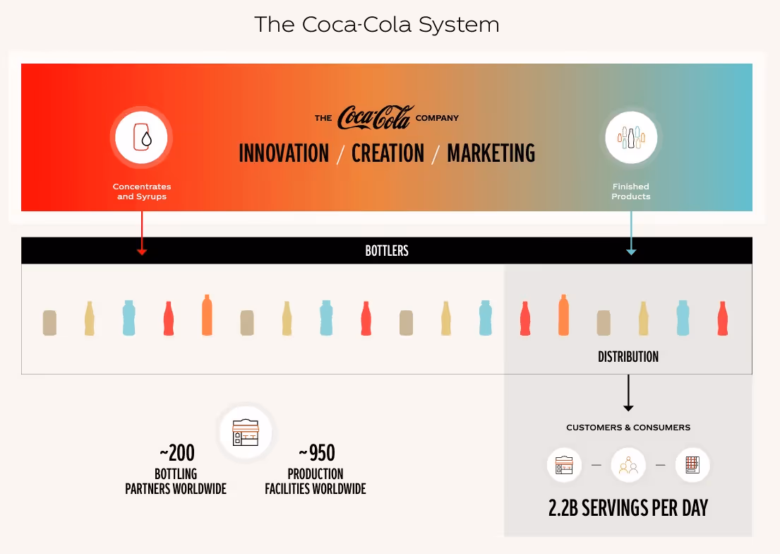 The Coca-Cola System is a network of over 950 bottling plants that produce 2.2 billion servings of Coca-Cola every day. The bottlers each hold contracts that allow them to exclusively operate in a predetermined territory. This reduces the need for the competition from multiple companies that sell the same product.