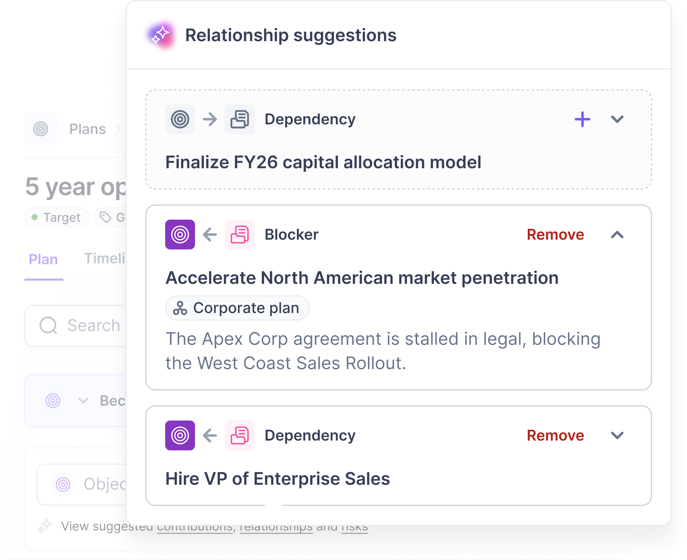Our AI interprets the logic within your documents to identify parent goals and contributing initiatives ensuring every outcome is aligned from the start.