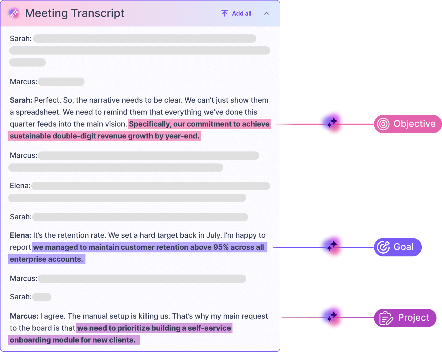 Automatically converts conversation into structured updates.