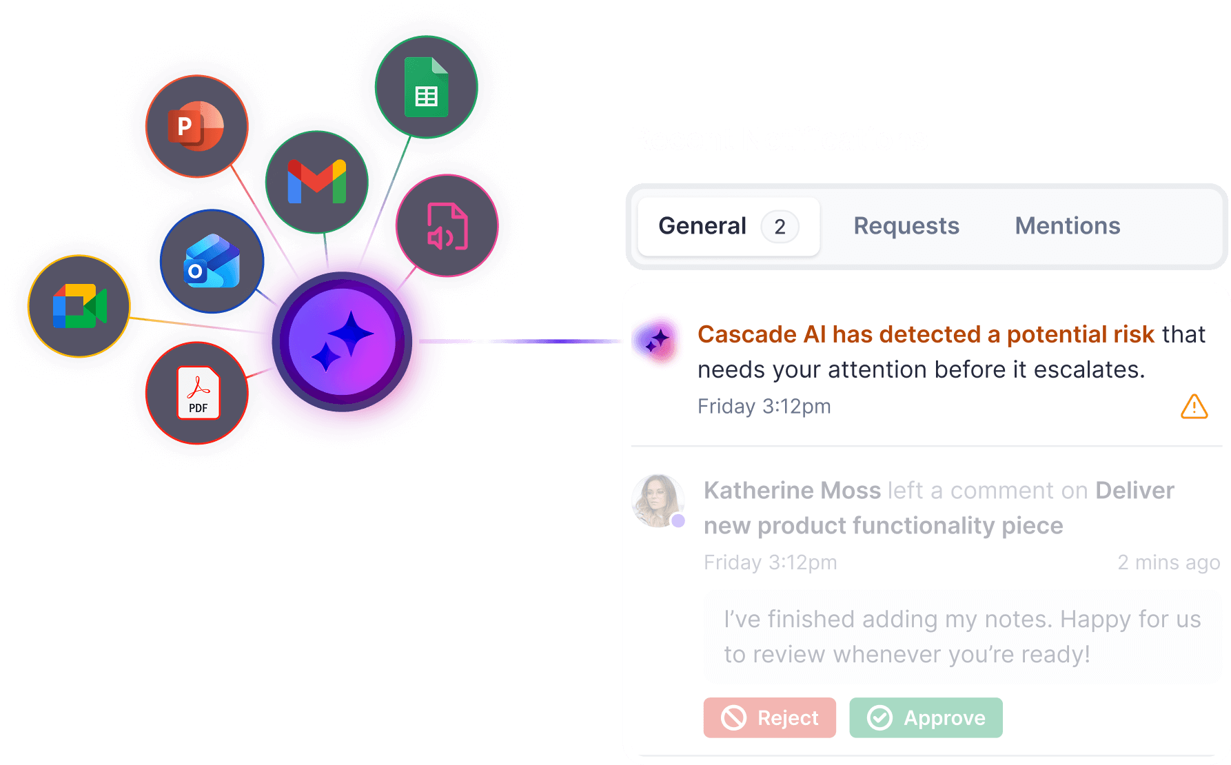 Stop chasing status reports. Cascade captures progress directly from your meetings, emails, and documents to write the updates for you.