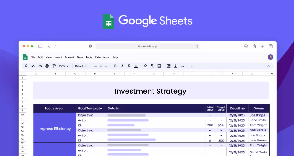 If you’re ready to accelerate your strategy and see faster results, Cascade Strategy Execution Software provides a seamless platform that makes planning, tracking, and executing your investment strategy straightforward and impactful. Move beyond the limitations of spreadsheets with Cascade's real-time updates, centralized collaboration, and automated reporting to ensure you can focus on maximizing returns while minimizing risks. Sign-up for free or book a demo with one of our strategy experts today!